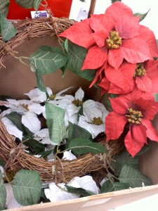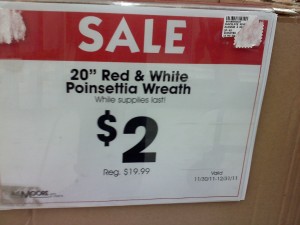 I happened to run into a HOT deal at AC Moore while shopping there tonight! They have select wreaths on sale for $2.00. These are regularly priced at $19.99 so that makes it almost 90% off!! The sign stated it was on the red and white poinsetta wreaths (pictured below), however, they also had a box of plain green-leaf wreaths with the same sign attached to them. I purchased those ones and they rang up $5, but they manually adjusted the price for me! These are simple wreaths, but my plain is to add some finishing touches for a very cheap decorative piece for our front door!