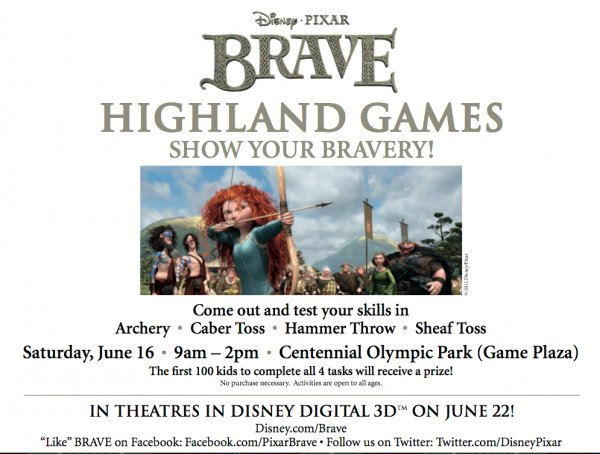 Atlanta Area Readers: If you do not have a jam packed weekend consider heading to the BRAVE Highland games at Centennial Olympic Park from 9:00 am until 2:00 pm. Events include archery, caber toss, hammer throw & sheaf toss. The first 100 kids to complete all the activities win a prize! This is a FREE family event open to everyone.