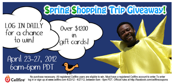 Don’t miss the Cellfire Spring Shopping Trip Giveaway. Cellfire is giving away five, yes FIVE, $200 grocery shopping trips this week! Head to the Cellfire website between the hours of 9:00 am and 9:00 pm EDT from April 23 to April 27 to see if you are a winner. All you have to do is log in and click the banner. One winner will be randomly selected each day. If you don’t win be sure to load a coupon to your card because there is a second prize of $50 when you clip one coupon during the same time frame.