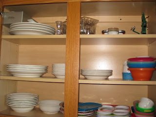 Time marches on! As part of Money Saving Mom’s Clear out the Clutter Challenge I cleared out my kitchen. It certainly feels good to have the clutter gone! Our community yard sale is on Saturday (with a 60% chance of rain) so I have been going through every room in the house getting rid of the junk. I lugged down box after box after box to the garage this afternoon to start tagging/sorting. I hope the rain doesn’t stop this yard sale from happening! Here is the one cupboard that I could get to cooperate when uploading pictures.