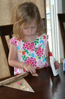 First I cut two triangles out of the cardboard (Kix) box. Then we used our brown paper bag (leftover from a Sunday paper) and wrapped the cardboard making sure that the entire triangle was brown.