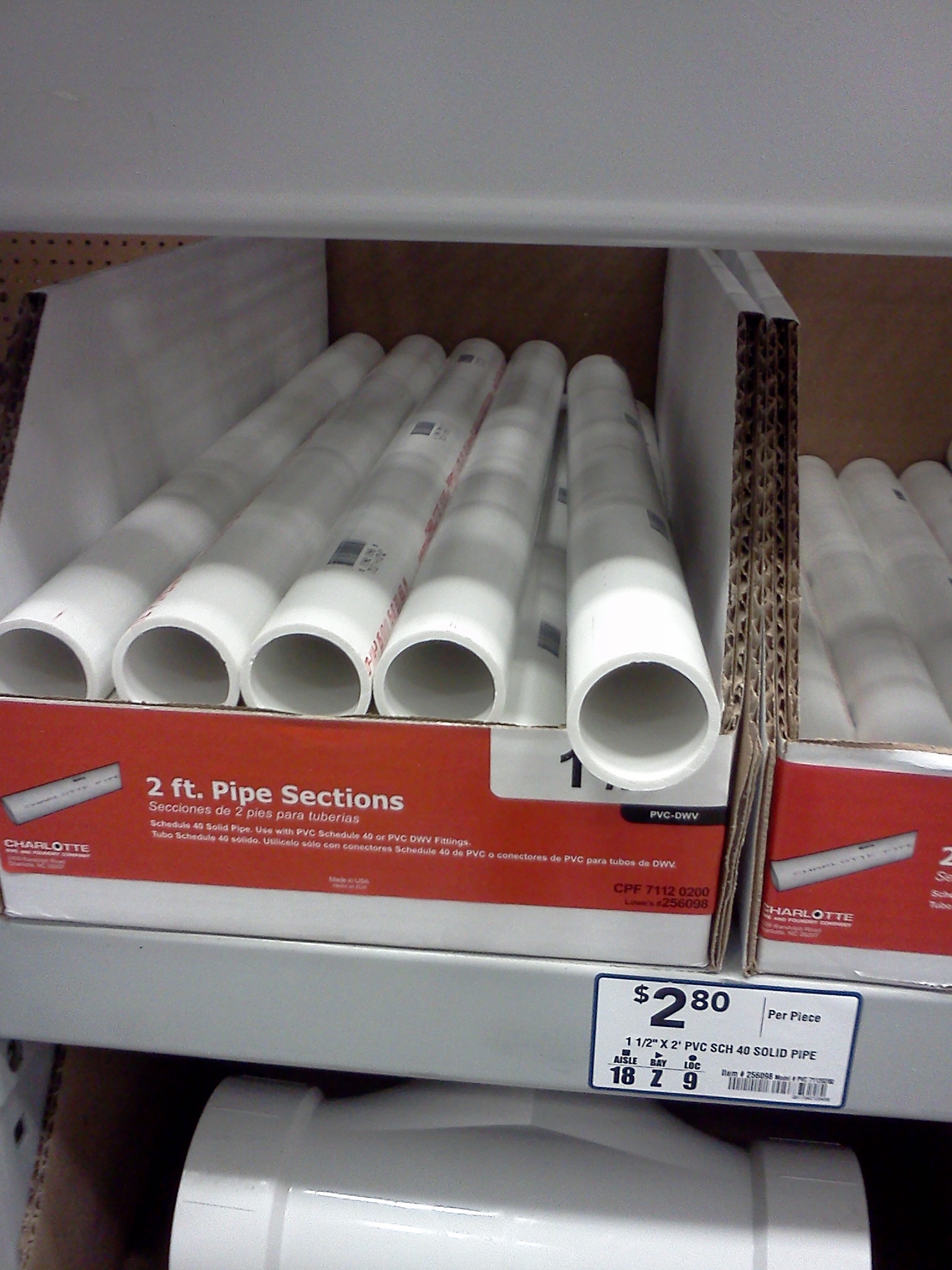 - 1 1/2″ thick PVC – A short piece. Figure out how long you want it before you buy it. Then have the wonderful store employees cut it for you! Trust me on this – I was out there with a saw and it just wasn’t a pretty (or safe) scene. The cheapest PVC was priced at $2.80 at Lowes