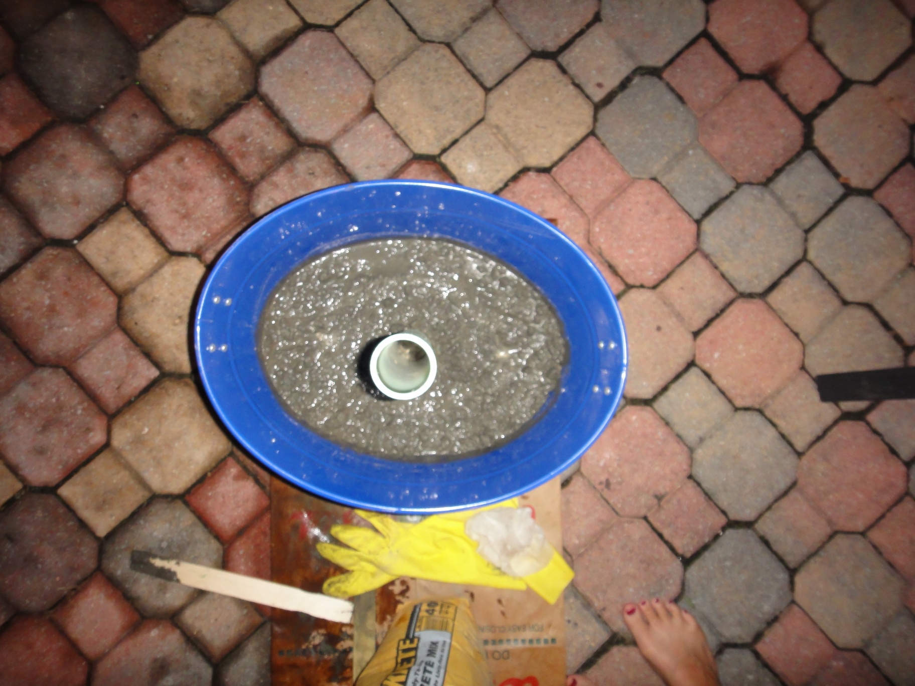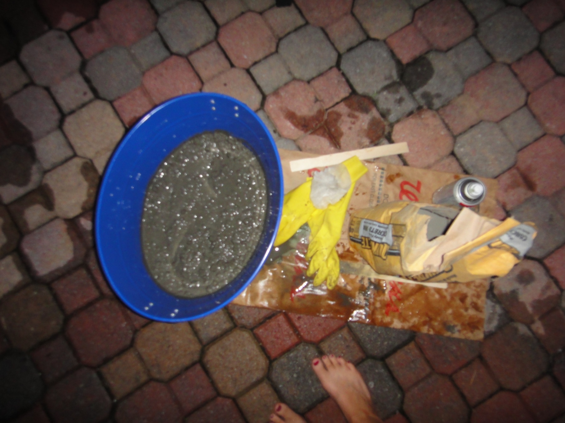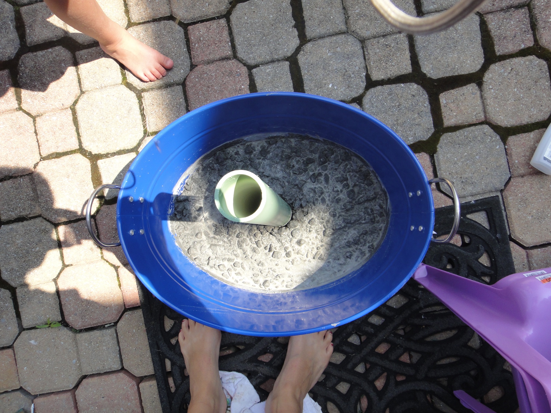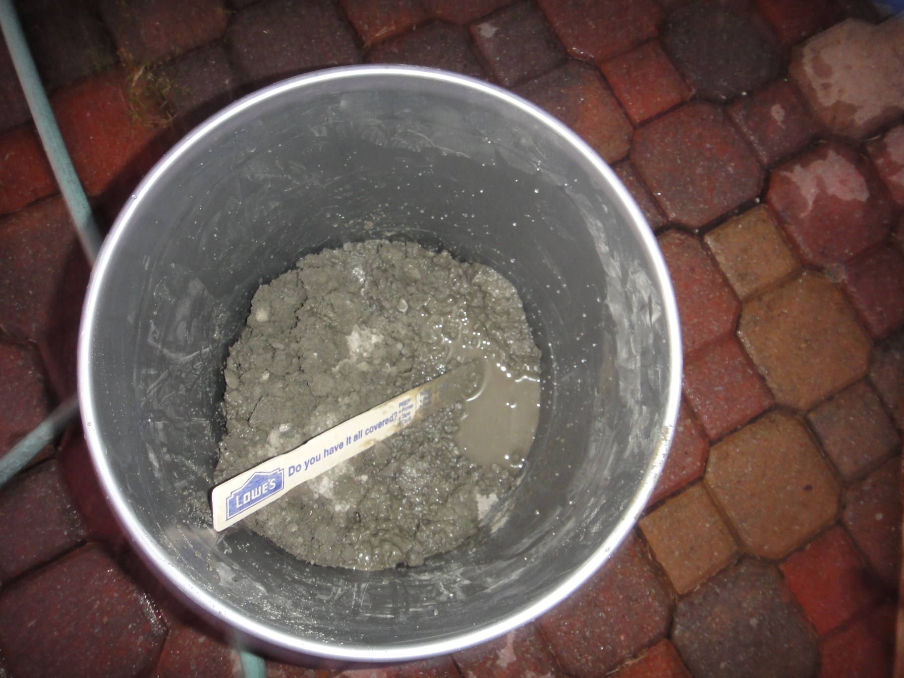 2) Mix the Quickrete in the extra bucket. I have no tips for doing this as it was my first time. It was hard to mix with the paint stick but once I dumped it into the decorative beverage container I was able to get the last bits mixed in.