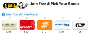 Remember – when you sign up for Ebates you will receive a $10 Gift Card (Home Depot, Target, Barnes & Noble or a $5 Ebates credit. This will be applied to your account within 30 days after a $25 purchase has been made through Ebates.