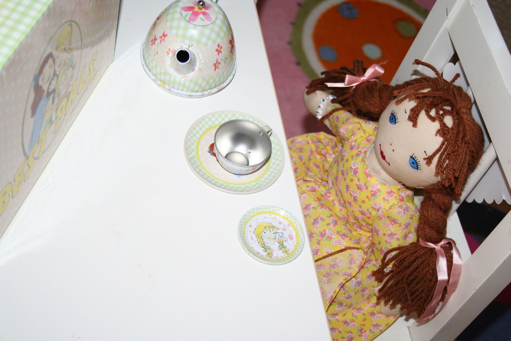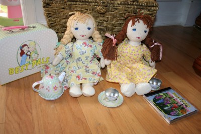 The Best Pals rag dolls (retail value $25) measure 16″ and are available in 6 different styles: Kathy, Janet, Lily, Sofia, Isabelle, and Danny Boy. The Best Pals Tin Tea Set (retail value $29.95) is perfect for playing tea party. Complete with a carrying case, tray, teapot, 4 cups, 4 saucers, and 4 plates this set is fun for everyone.