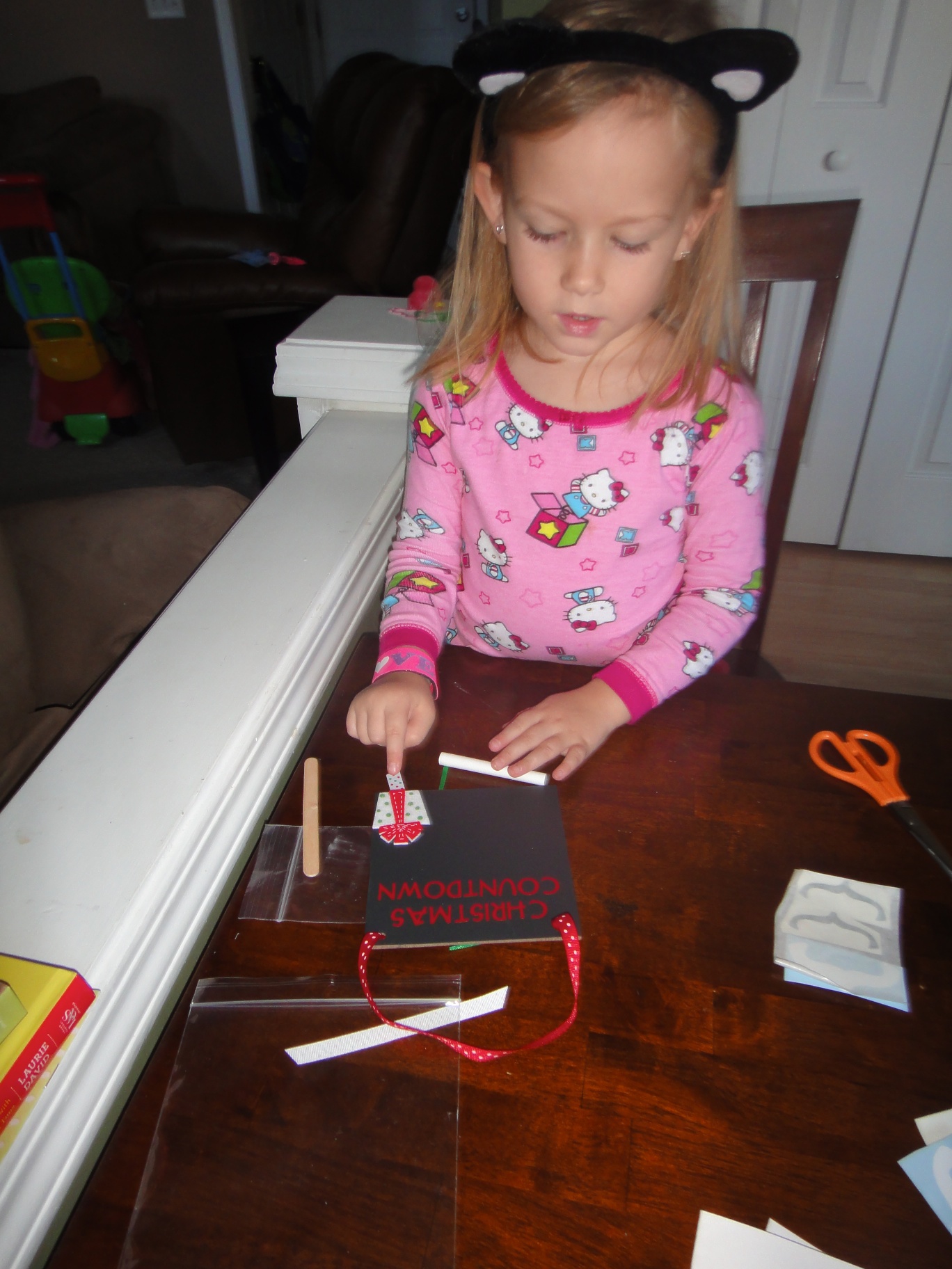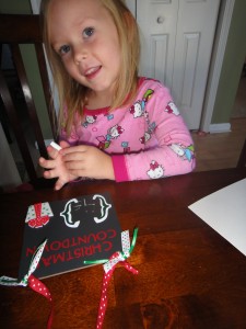 The Christmas Countdown used transfer tape, something I was unfamiliar with. The directions supplied in the kit were perfect and we had no trouble using the transfer tape. I now think both Freckles Crafts and transfer tape are brilliant! Both of these crafts were sooooo much fun and each of my daughters asked for more. The Christmas Countdown is such a success that Natalie has asked to hang it on just about every surface in our downstairs. She is now anxiously awaiting the Christmas tree so she can hang it there. For the record…..there are 48 days until Christmas. 🙂