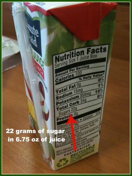 Before doing my research I didn’t really question what my children were consuming. They don’t drink juice boxes often. But my eyes almost popped out of my head when I realized that this ONE juice box has 22 grams of sugar, which is 5.5 teaspoons of sugar.  In that juice box – that says “No Sugar Added!!!!”