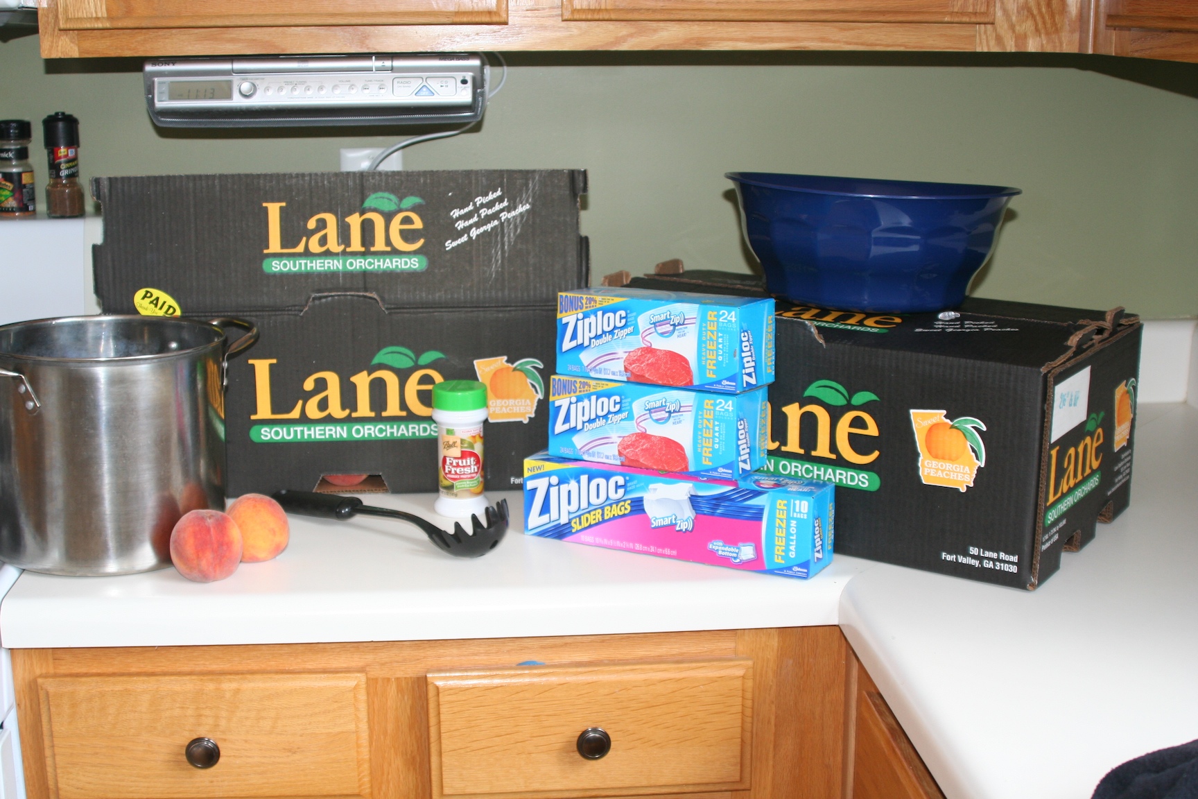 Summer time brings peaches and nectarines by the barrel. Prices on these fruits are falling and now is the perfect time to freeze some delicious summer fruits to enjoy in the dreary winter months. While I was in college I helped my grandma and aunt “put up” peaches from a local orchard in Oregon. Living in Georgia, the peach state, I am not quite sure where the orchards are. Our local Whole Foods had peaches for 49¢/lb or $11.21/box last week so I bought two boxes and turned them in to a bunch of frozen deliciousness! Here are step by step instructions on a simple way to freeze peaches. The only thing you are likely to not have on hand is the Fresh Fruit. Look for it near the canning supplies at your local grocery store.