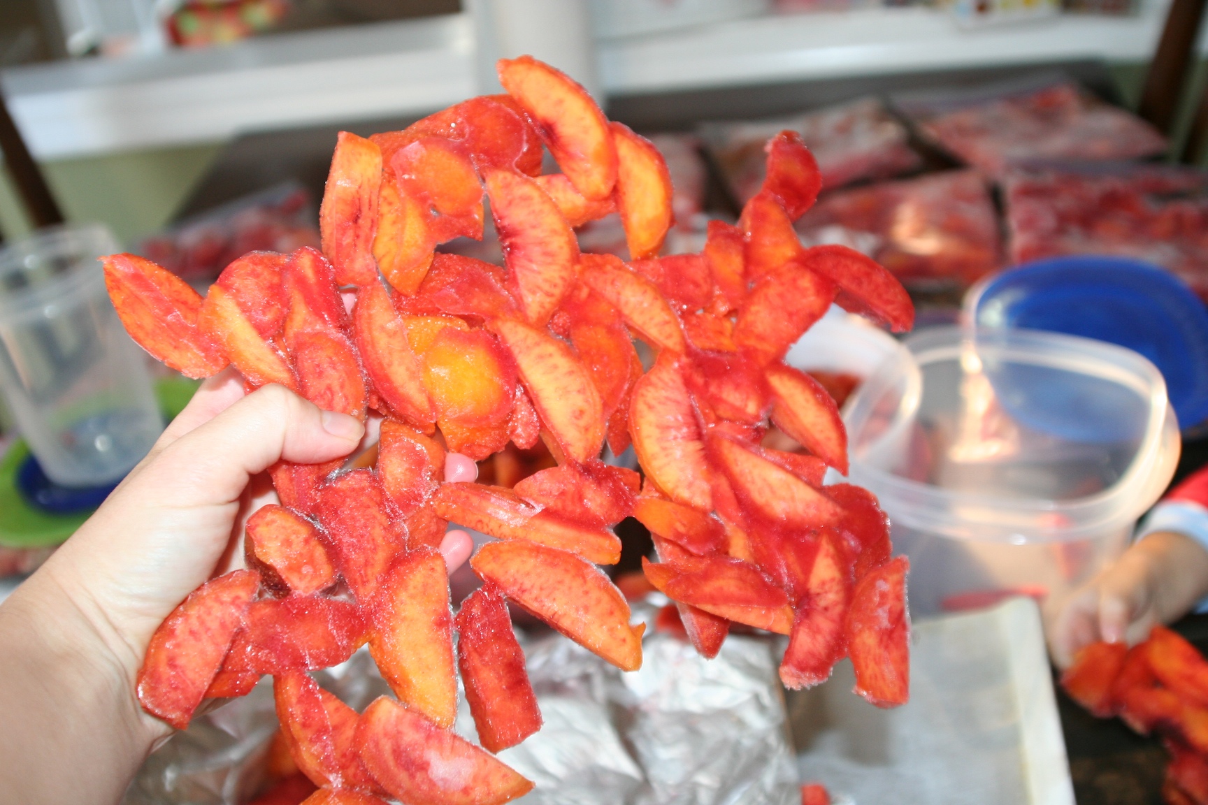I took a gamble when I froze the peaches. I put foil on a few cookie sheets and placed sliced peaches on the foil to freeze. I was not sure if the peaches would have terrible freezer burn. I was pleased to find out that my experiment worked and the peaches did not burn. We are huge fans of frozen fruit at my house and those bowls will not last long. It was fun to peel the massive peach conglomeration from the foil.