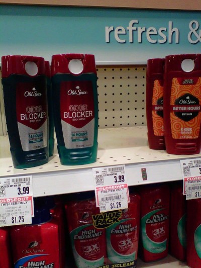 Closeout Old Spice Body Wash. It was marked down to $1.25. There is $1/2 in the 02/27 P&G as well as an e-coupon.