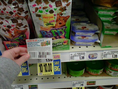 Free cans of cat food peelies on the already free cat treats! The peelies were only on the Party variety. You will find the coupon for the kitty treats in the 01/23 Smart Source.