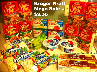 With the great printable Kraft coupons and the deals at KrogerI had to go shopping today. I headed to Kroger a few minutes ago and picked up 21 items for $9.36 out of pocket. After coupons, the Stove Tops were 29¢ each, Cool Whips were 49¢ each, Jell-O’s were 99¢ each, Marshmallows were 19¢ each, and noodles were also 19¢ each. The bananas were 96¢ of my total. To see how I scored these awesome deals and read the Kroger Deals with Printable Kraft Coupons: 19¢ Marshmallows, 29¢ Stove Top, and More post.