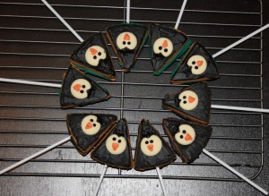 The Penguin Cake Pops were completely the idea of my mother-in-law. Using triangle shaped cookies we created cookie sandwiches with frosting in the middle. We added a sucker stick to the frosting in the middle and a white Wilton candy melt for the face. Pretty cute! A