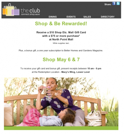 If your Macy’s is in the mall and you are out shopping be sure to see if your mall participates in The Club, Shop Etc. In celebration of Mother’s Day they are giving away $10 Shop Etc. mall gift cards when your shopping transaction total $75 or more! You will also receive a one year subscription to Better Homes and Gardens. This event is at participating locations only.