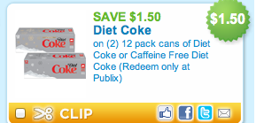 There is a hot printable Publix coupon. You can save $1.50/2 Diet Coke or Caffeine Free Diet Coke with this printable coupon. It is a Publix coupon and does not have a bar code to use at other stores. I found mine with zip code 30022. Printable Coke product coupons are very rare. Print this while you can!