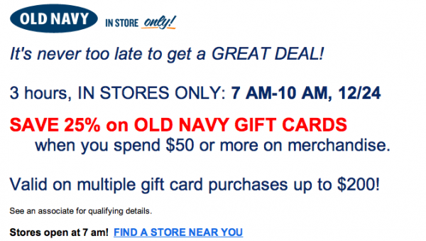Were you planning on shopping on Christmas Eve? If not, you may want to reconsider! Old Navy is offering 25% off Old Navy Gift cards when you spend $50 or more on merchandise (valid on multiple gift card purchases up to $200). Old Navy Gift Cards are redeemable at Old Navy as well their sister stores including GAP, Banana Republic, Piper Lime, and Athleta.