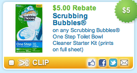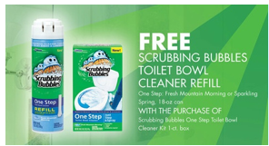 Print the $5.00/1 Scrubbing Bubbles One Step Toilet Bowl Cleaner Starter Kit coupon (use zip 32256). Then change the zip code and print the $5.00/1 Scrubbing Bubbles Starter Kit Mail In Rebate (zip 77477). Grab your free One Step Scrubbing Bubbles Refill to accompany this deal!