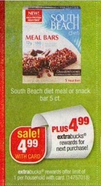 South Beach diet meal or snack bar (5 ct), $4.99 – Receive $4.99 Extrabucks (Limit 1)