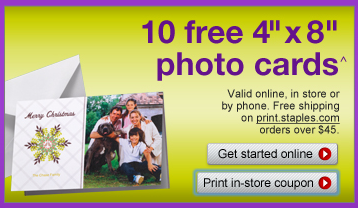 Valid 10/30/11–11/12/11 online at print.staples.com/freecards1030, by phone at 1-888-333-3199 or in U.S. Staples stores on item #334632. Limit 10 free holiday cards per customer. Excludes Deluxe holiday cards. While supplies last. Limited quantities of free item. If the featured gift item is out of stock, Staples reserves the right to offer a substitute item of equivalent value. Free photo cards do not contribute toward our minimum order threshold of $45 on print.staples.com required for free shipping. Cannot be combined with any other offers and does not include tax. Not valid on prior purchases or on purchases made