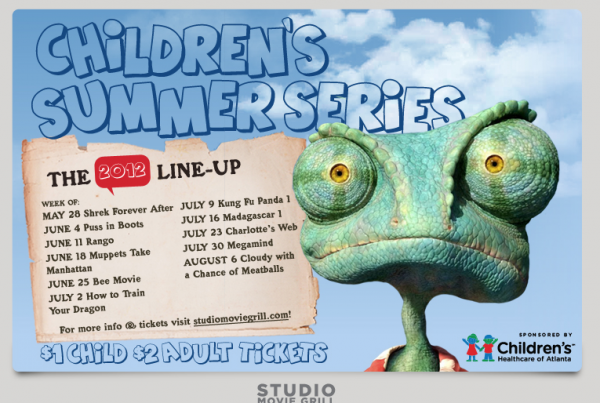 If you live in the Atlanta Area and are looking for a fun way to beat the summer heat then take note of Studio Movie Grill’s Children’s Summer Series 2012 Line-Up. Each week features a different kid’s film which will play Monday – Friday at 11:00 AM. Children’s tickets are $1, adults get in for $2.