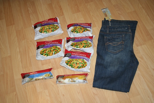 I paid $1.52 out of pocket for 5 bags of frozen veggies, 2 frozen burritos, and a pair of jeans. Woohoo! My plan is to buy frozen veggies every.single.day of the sale. They are priced at $0.97/bag and the burritos are $0.84/each.