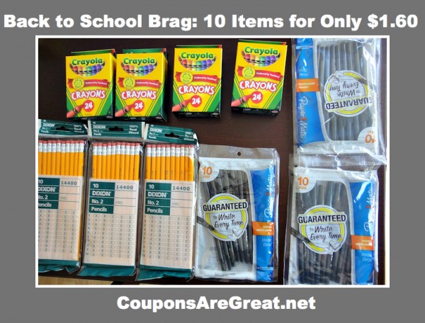 It’s the season to be back to school shopping! While we are finding great deals, it is certainly OK to brag a little about what we buy. While I was out looking for a bathroom vanity this morning I stopped by Office Max and Toys R Us and picked up 10 Back to School items for $1.60 (that’s a savings of 84%)! Here is the break down: