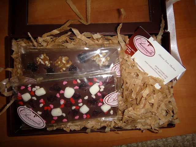 After looking over all the custom toppings I ordered 2 milk chocolate candy bars from Choccreate. The first bar was all for me and had Bing Cherries and Walnuts. The second was for the girls and it had mini-marshmallows, raisins, and heart sprinkles. My first “ahhh” was over the incredibly cute box that the candy bars came in. I have a weaknesses for the pink and brown color combination. This box now holds many teeny little toys from around our house. It was so cute that I just couldn’t bear to part with it! As for the candy, well, I kind of remember it. It was so good that I practically inhaled my creation. It was my chocolate my way and it was delicious! The girls also thought their candy was “yummy in their tummies.”