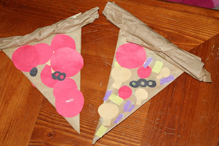 Then we rolled up some of the packaging paper to form a pizza crust and glued that on to our brown triangle. We put a hardback book on top to help squish it down when it dried.
