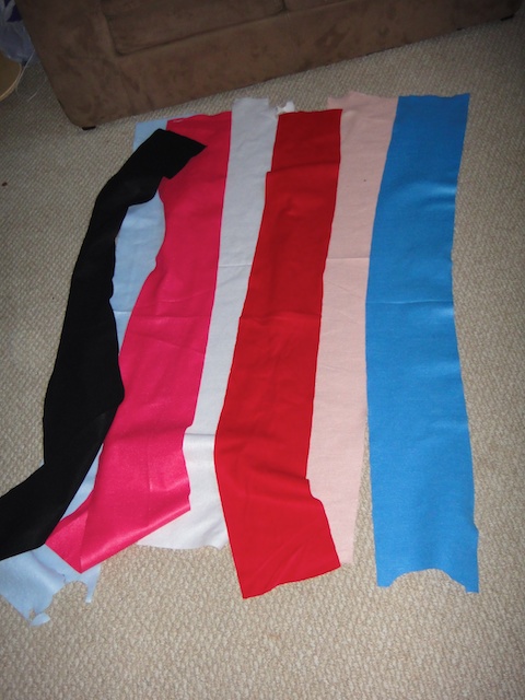 I bought each piece of felt below for 75¢ each at JoAnns. Buying from the bolt is the way to go! On sale the felt was $2.99/yd and I bought 1/4 yard of each piece. Seven colors at 75¢/each cost me $5.25 for ALLLLL of that felt! Clearly I barely made a dent in the amount that we had and we have plenty of felt left for other activities. This craft is perfect for using stained clothing since you may possibly cover the stain up, but you can also buy new t-shirts. The t-shirts I had were stuck in the closet from Target’s clearance. I think I paid $1.50/each for the girls’ shirts. My total cost for this project (including one shirt for each girl and one for me) is under $10.