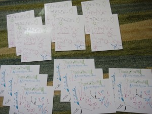 This may be a totally lame Crafty Tuesday post, but the point is this – Do crafts that are at your children’s level. Get out supplies that your children bug you to use, but you always say no (Sharpies). Turn something that you should be doing (like Thank You cards) in to a quick, fun craft. Not all crafts need to be long drawn out masterpieces. Some of the best works are done in a matter of minutes. Crafts should be fun. My girls loved using the Sharpies and have asked when they get to use them again. 🙂 I call our very simple Thank You cards a success.