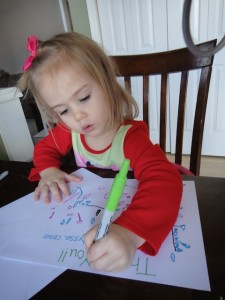 Sending Thank You Cards is incredibly important to me and I want my girls to learn the value of a handwritten note. Since my girls are four and (a few weeks away from being) three sitting for long periods working on Thank You’s is more of a chore than fun. I decided that this year we were going to make ONE thank you card and I was going to have it photocopied. By taking the chore out of the task of writing Thank You’s and making it fun I believe the girls will be more inclined to want to do this in the future.