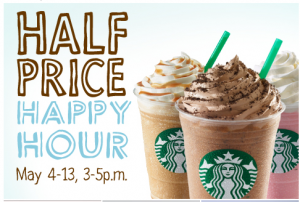 Can you sneak away between 3:00 and 5:00 pm to enjoy Starbuck’s Half Price Happy Hour? You will get 50% off your Frappuccino during that time from from Friday May 4th to Sunday May 13th. Your wallet will definitely love you!