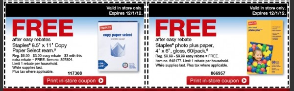 Stock up on free copy paper and photo paper at Staples this week!  Get one free Staples Brand copy paper ream and one free Staples Photo Plus Paper after coupon and easy rebate.  These offers are valid through December 1, 2012.